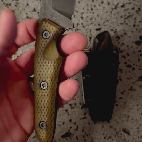 Handle: burnt OD green micarta (done by hand so each one is different)